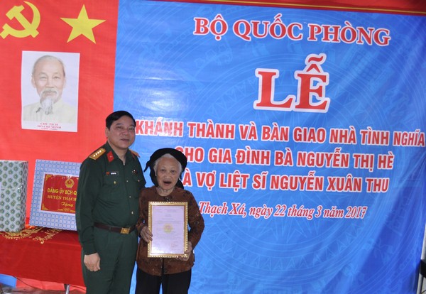 Trao Quyết định tặng nhà tình nghĩa của Bộ Quốc phòng cho bà Nguyễn Thị Hè, là vợ liệt sĩ Nguyễn Xuân Thu.