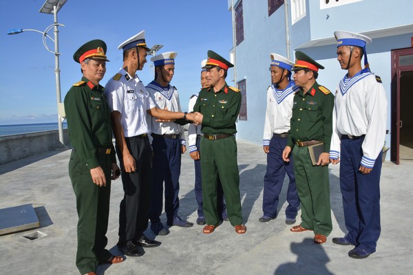 Đại tá Lê Văn Huyên, Phó Chính ủy Bộ Tư lệnh Thủ đô Hà Nội động viên cán bộ, chiến sĩ đang công tác trên đảo Tiên Nữ.