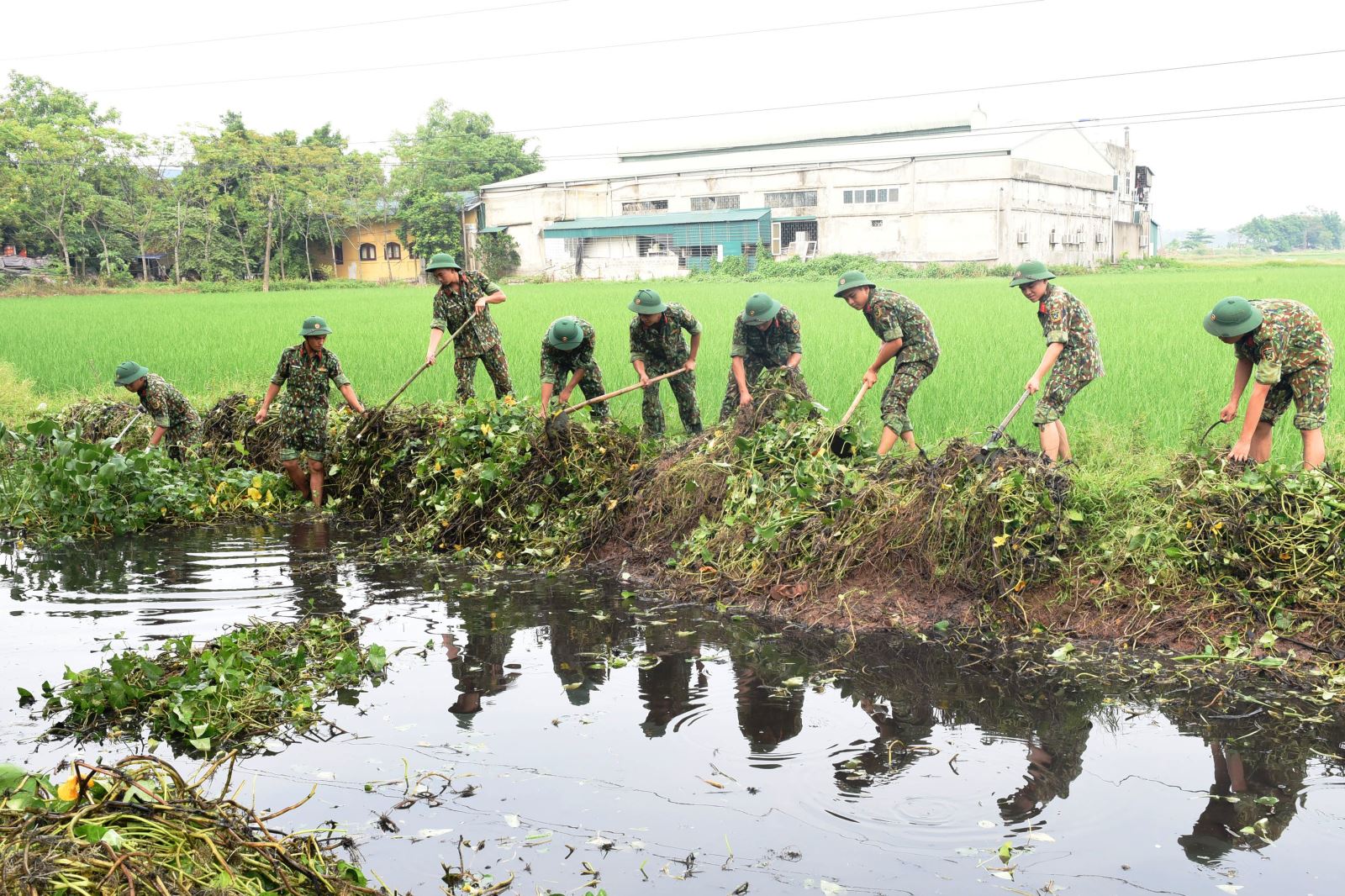 Về công tác tại xã Phúc Lâm, chúng tôi có dịp theo chân cán bộ, chiến sĩ Tiểu đoàn Trinh sát 20 giúp dân nạo vét, khơi thông dòng chảy các tuyến kênh mương nội đồng, đảm bảo nước tưới cho bà con nhân dân sản xuất nông nghiệp. Không chỉ có bộ đội mà còn có Đoàn Thanh niên, Cựu chiến binh xã cũng tham gia tích cực. Không khí lao động diễn ra khẩn trương, nghiêm túc. Bác Nguyễn Văn Hoan (55 tuổi) ở thôn Chân Chim chia sẻ: “Có bộ đội về giúp nhân dân nạo vét kênh mương sạch sẽ thế này, tôi thấy thật đáng quý. Người dân trong thôn ai cũng phấn khởi. Hôm nay, chúng tôi đều hưởng ứng tinh thần tình nguyện vì cộng đồng của đơn vị, thu xếp thời gian ra đây động viên, xắn tay làm cùng bộ đội. Xong việc, tất cả sẽ quay về để dọn dẹp vệ sinh đường làng, ngõ xóm”.
