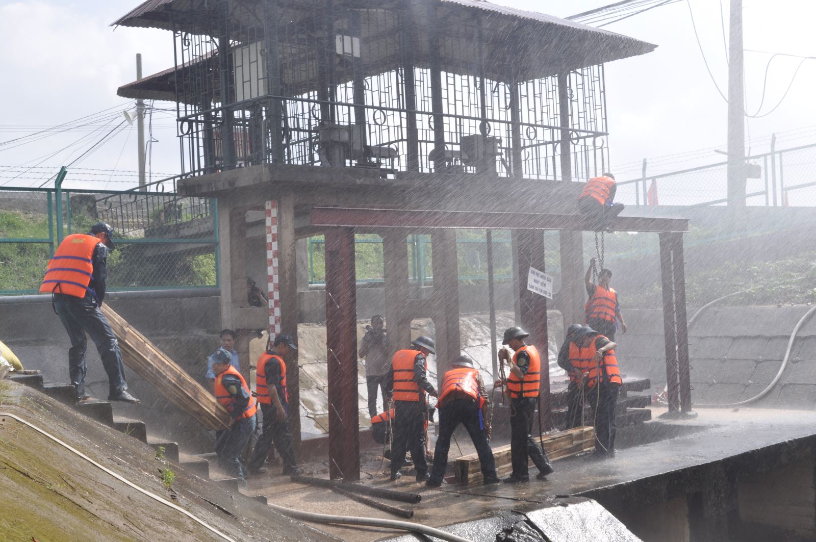 Lực lượng dân quân xã Võng La diễn tập phòng chống lụt bão.