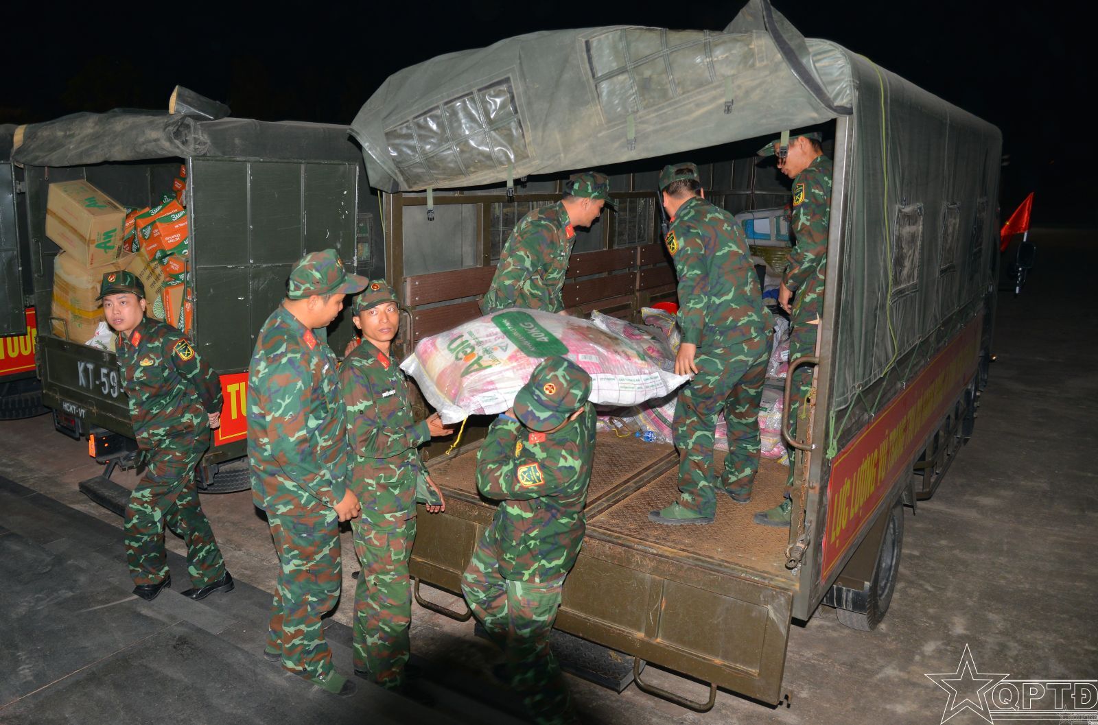 Cán bộ, chiến sĩ Bộ Tư lệnh Thủ đô Hà Nội vận chuyển hàng cứu trợ nhân dân vùng lũ của tỉnh Gia Lai.