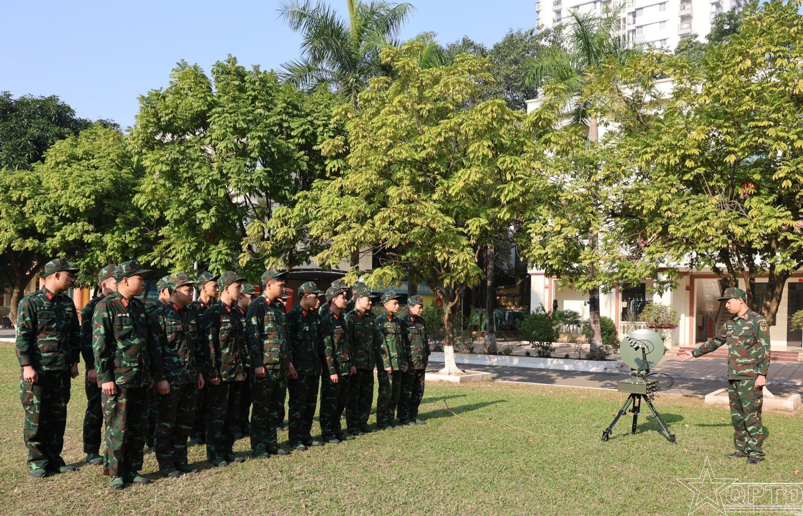 Trong giờ huấn luyện triển khai thiết bị Visat ở Tiểu đoàn Thông tin.