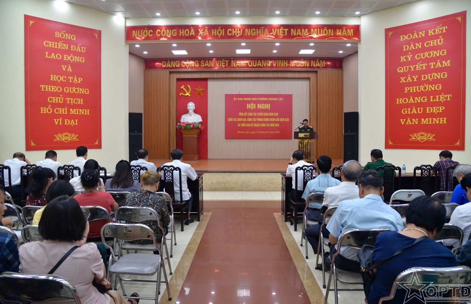 QPTĐ-Chiều 13-4, phường Hoàng Liệt đã tổ chức Hội nghị tổng kết công tác tuyển chọn, gọi công dân nhập ngũ và thực hiện nghĩa vụ tham gia Công an nhân dân năm 2026; công tác giáo dục quốc phòng và an ninh (QP&AN) và công tác phòng không nhân dân (PKND) năm 2025.