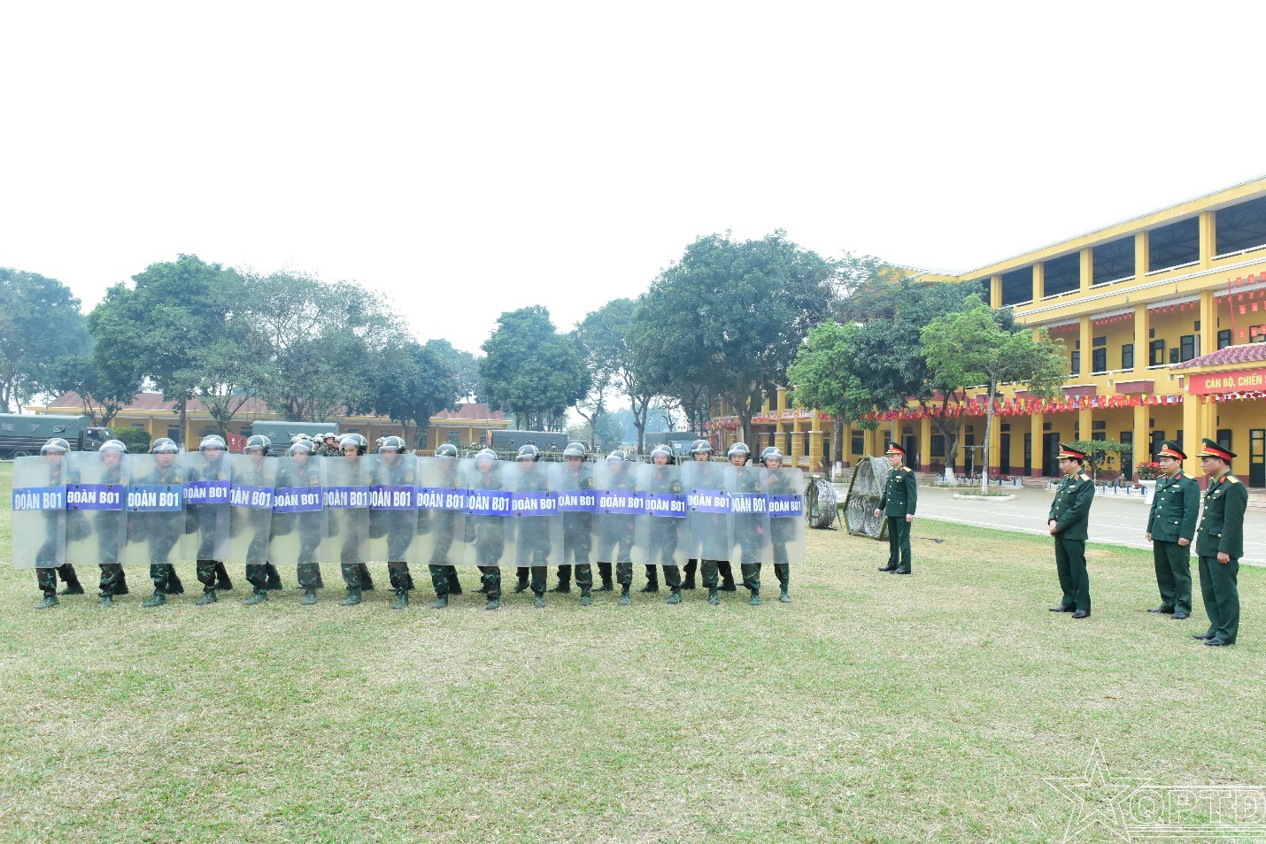 Nội dung thực hành đội hình lá chắn đòi hỏi sự hiệp đồng chặt chẽ và bản lĩnh vững vàng.