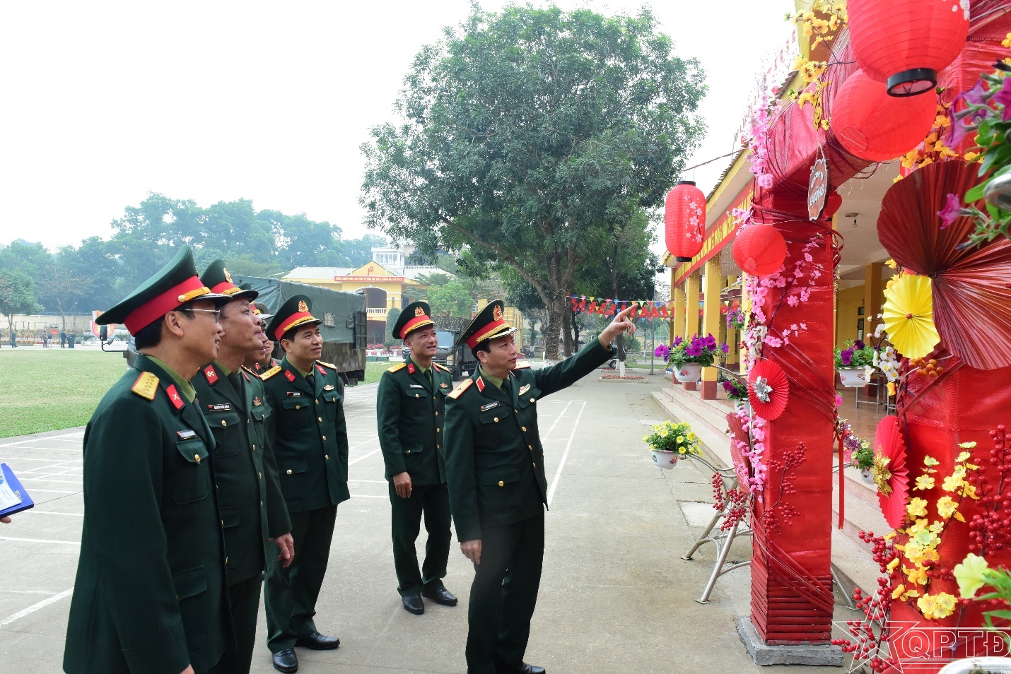 Thiếu tướng Nguyễn Đình Thạo cùng Đoàn công tác dừng chân tham quan cổng chào đón Xuân của các Đại đội thuộc Tiểu đoàn 5. Những vật liệu gần gũi qua đôi bàn tay khéo léo của các chiến sĩ đã trở thành tác phẩm nghệ thuật mang đậm dấu ấn “lính trẻ Thủ đô”.