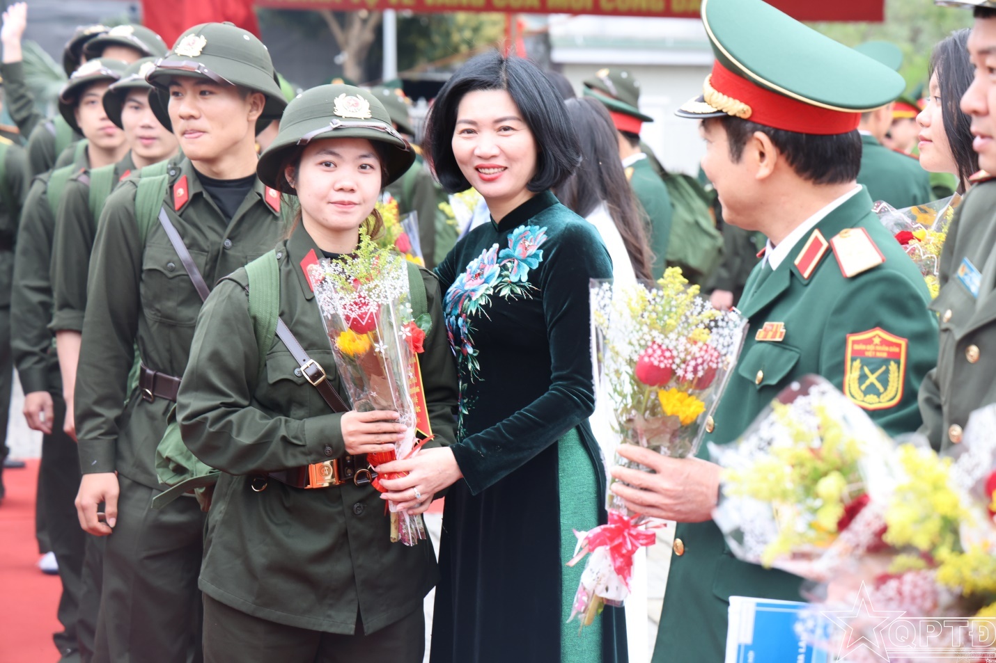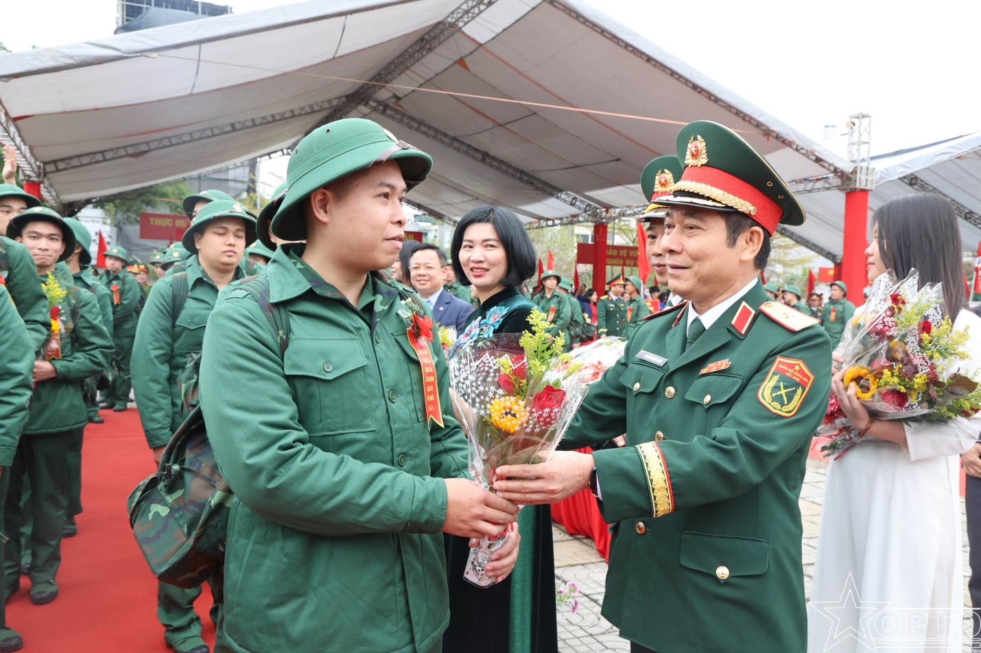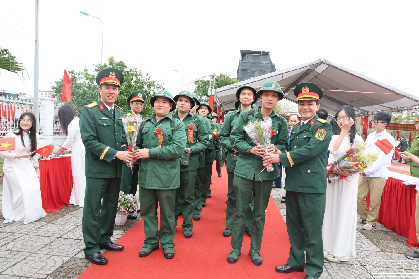Các đại biểu tặng hoa cho các tân binh lên đường nhập ngũ.