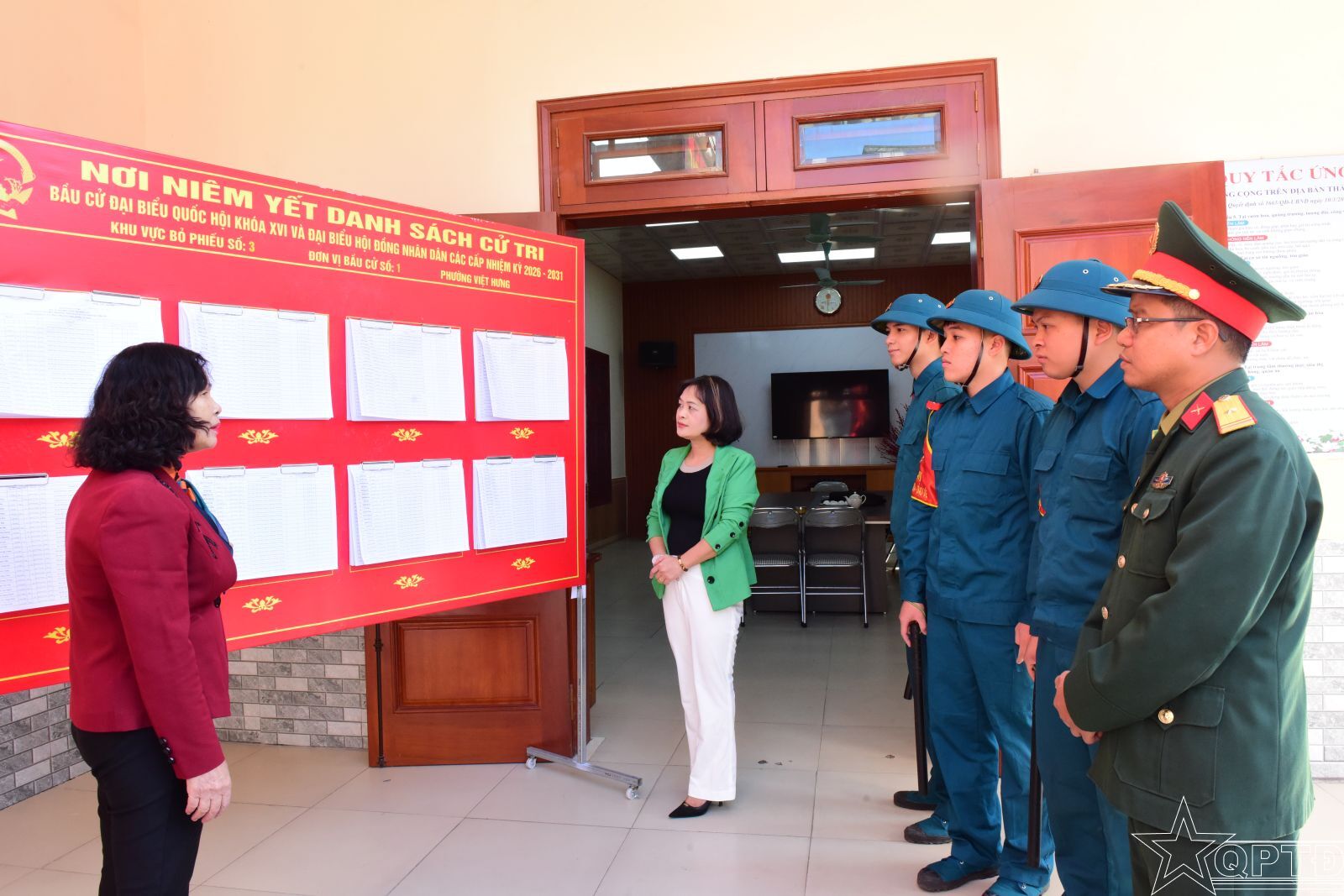 Cán bộ, chiến sĩ Ban CHQS phường phối hợp kiểm tra công tác chuẩn bị và niêm yết danh sách cử tri, đảm bảo tính công khai, minh bạch trước giờ bầu cử.