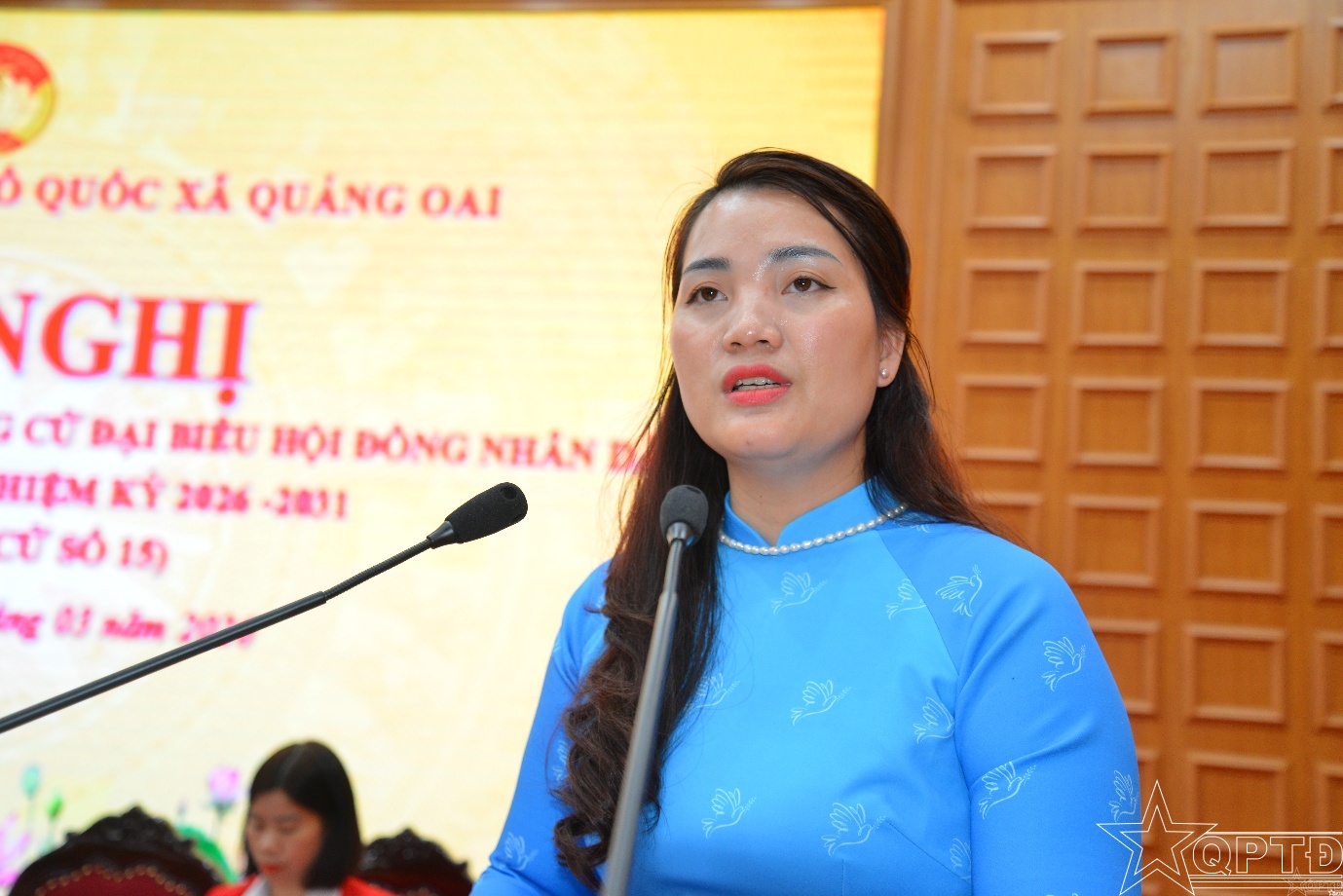 Tại Hội nghị, đại diện Ủy ban Mặt trận Tổ quốc Việt Nam xã Quảng Oai đã giới thiệu tóm tắt tiểu sử của các ứng cử viên đại biểu HĐND thành phố Hà Nội khóa XVII tại Đơn vị bầu cử số 15. Theo đó, danh sách ứng cử viên gồm 8 đồng chí: Thiếu tướng Đào Văn Nhận, Ủy viên Ban Thường vụ Thành ủy, Phó Bí thư Đảng ủy, Tư lệnh Bộ Tư lệnh; đồng chí Đỗ Mạnh Hưng, Bí thư Đảng ủy, Chủ tịch HĐND xã Suối Hai; đồng chí Lê Văn Quân, Bí thư Đảng ủy, Chủ tịch HĐND xã Ba Vì; đồng chí Nguyễn Đức Tiến, Bí thư Đảng ủy, Chủ tịch HĐND xã Minh Châu; đồng chí Dương Thị Quỳnh, Phó Chủ tịch Ủy ban MTTQ Việt Nam, Chủ tịch Hội Liên hiệp Phụ nữ xã Ba Vì; đồng chí Phương Công Thạch, chuyên viên Phòng Văn hóa - Xã hội xã Ba Vì; đồng chí Phùng Thị Thanh Thơ, chuyên viên Văn phòng HĐND và UBND xã Minh Châu; đồng chí Đặng Thị Bích Phượng, Phó Bí thư Đoàn Thanh niên xã Minh Châu.