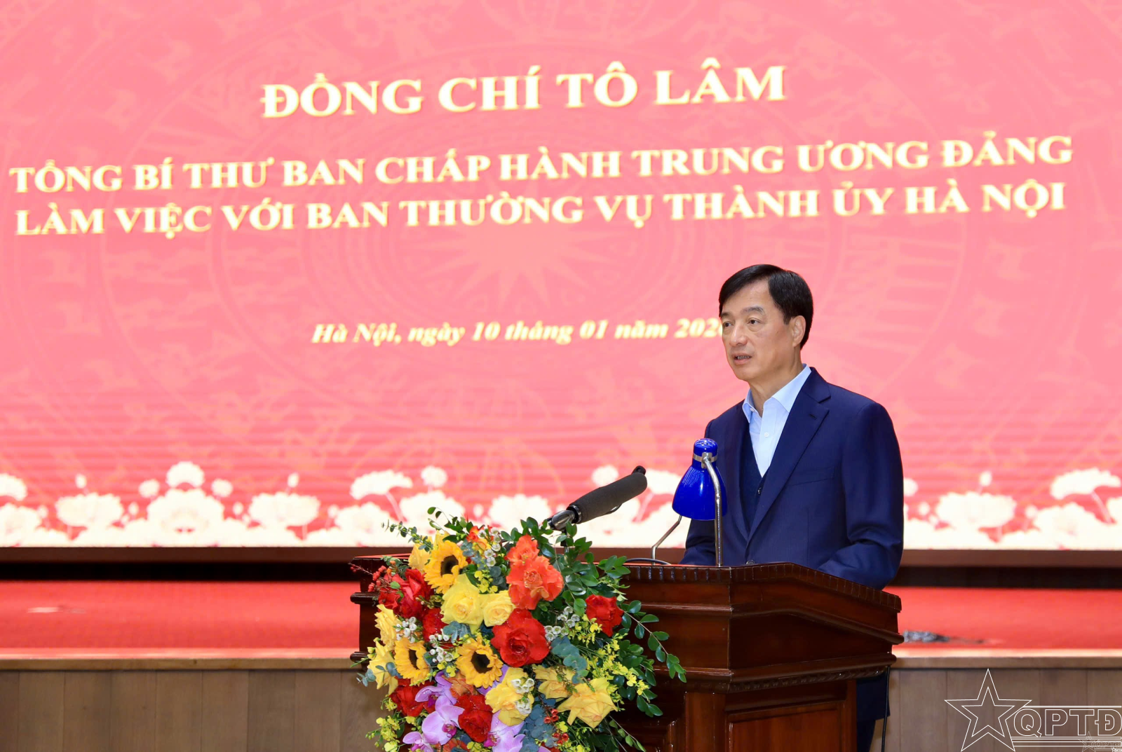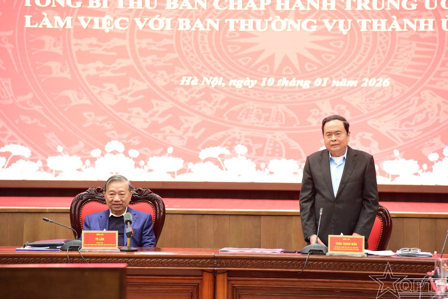 QPTĐ-Sáng 10-1, tại trụ sở Thành ủy Hà Nội, Tổng Bí thư Tô Lâm cùng các đồng chí Ủy viên Bộ Chính trị: Thủ tướng Chính phủ Phạm Minh Chính, Chủ tịch Quốc hội Trần Thanh Mẫn đã có buổi làm việc với Ban Thường vụ Thành ủy Hà Nội về đề xuất xây dựng Quy hoạch tổng thể Thủ đô tầm nhìn 100 năm gắn với hoàn thiện thể chế phát triển; định hướng mô hình phát triển kinh tế - xã hội và mục tiêu tăng trưởng hai con số trong giai đoạn tới.