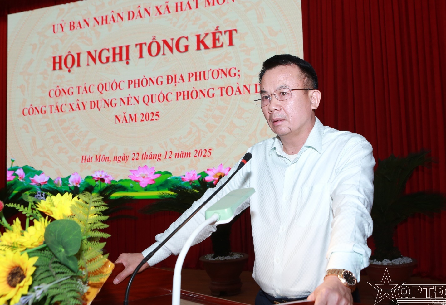 Phát biểu tại Hội nghị, Đồng chí Nguyễn Đình Sơn, Bí thư Đảng uỷ, Chủ tịch HĐND xã khẳng định, những kết quả đạt được trong công tác quân sự – quốc phòng năm 2025 của xã là toàn diện, thực chất và có chiều sâu, phản ánh rõ sự chuyển biến tích cực cả về nhận thức, tổ chức thực hiện và hiệu quả thực tiễn. Trước hết, nhận thức và trách nhiệm của cấp ủy, chính quyền, cán bộ, đảng viên và nhân dân đối với nhiệm vụ quốc phòng – quân sự tiếp tục được nâng lên rõ rệt; việc xây dựng nền quốc phòng toàn dân không còn được nhìn nhận như nhiệm vụ riêng của lực lượng vũ trang, mà đã trở thành nhiệm vụ chung, thường xuyên của cả hệ thống chính trị, gắn chặt với yêu cầu giữ vững ổn định chính trị và phát triển bền vững địa phương. Đặc biệt, trong bối cảnh xã Hát Môn được xác định là xã trọng điểm về quốc phòng, những kết quả đạt được không chỉ có ý nghĩa trước mắt, mà còn tạo nền tảng quan trọng, lâu dài cho việc xây dựng khu vực phòng thủ vững chắc ngay từ cơ sở. Truyền thống anh hùng cách mạng của quê hương tiếp tục được khơi dậy và phát huy trong tình hình mới, thể hiện sinh động ở sự đồng thuận xã hội, tinh thần trách nhiệm của cán bộ, đảng viên và nhân dân, cũng như ở hiệu quả thực tiễn của công tác quân sự – quốc phòng trong năm 2025.