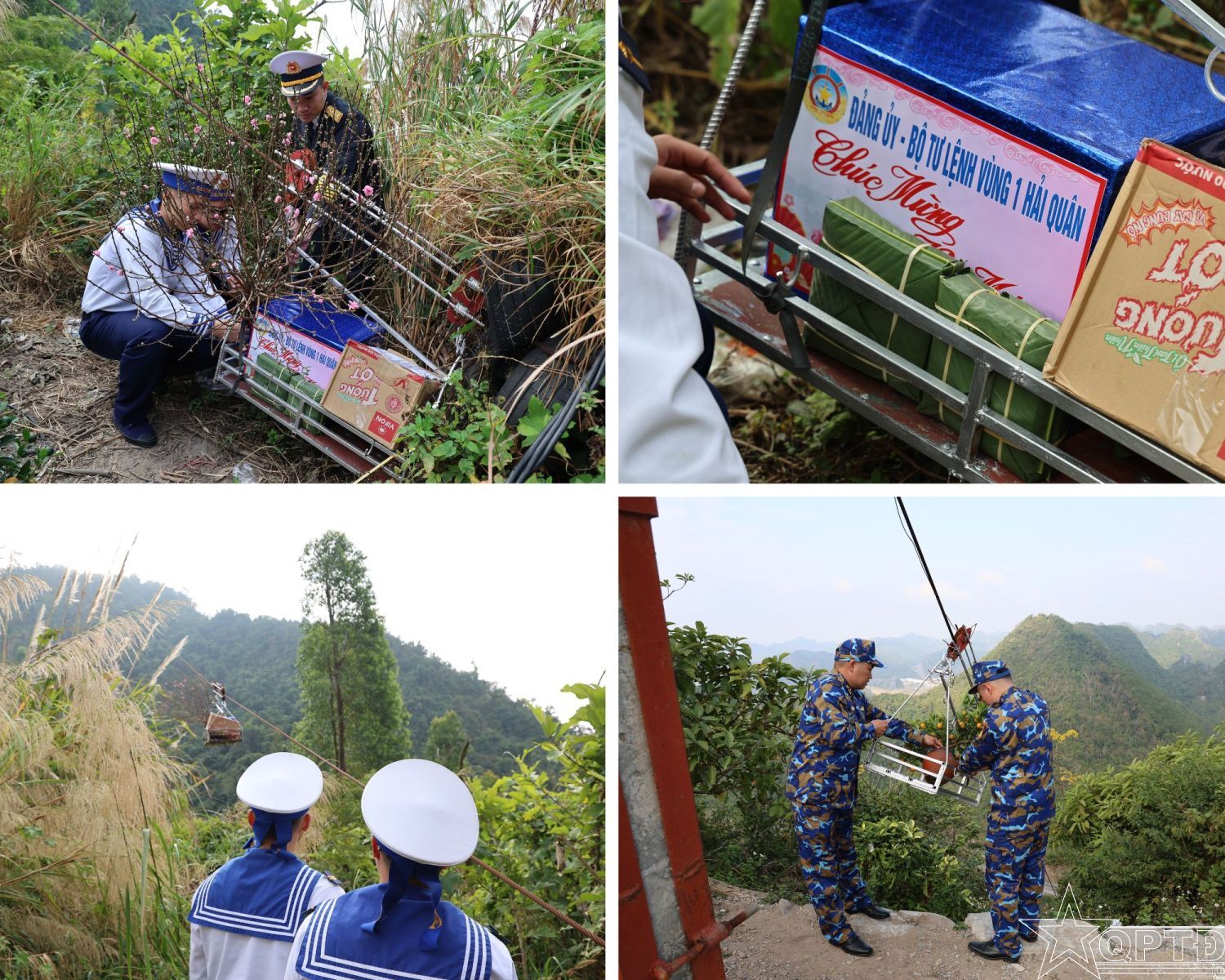 Từng món quà Tết được sắp xếp gon gàng chuyển bằng tời hàng lên điểm cao nhất của Trạm radar 495 (đặc khu Cát Hải).