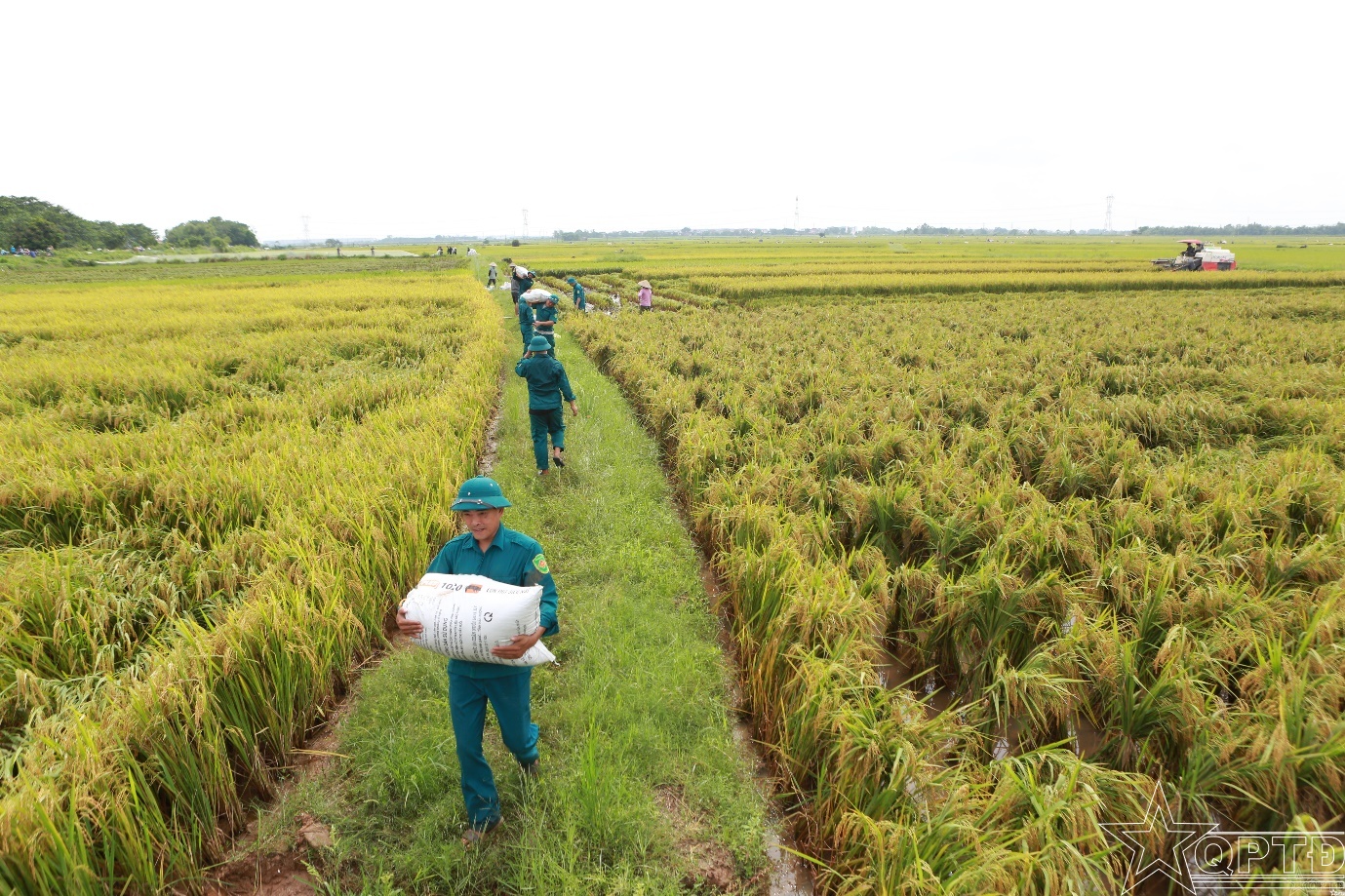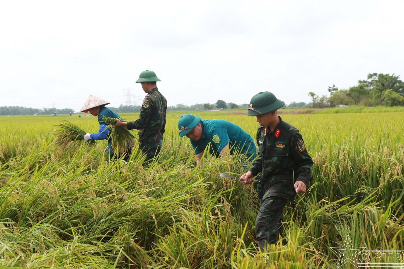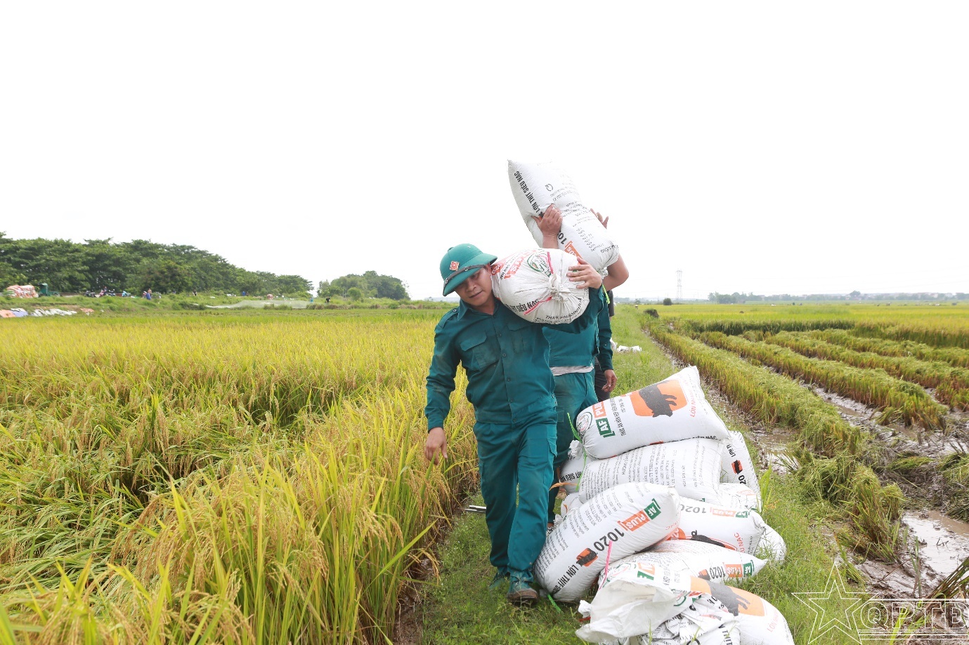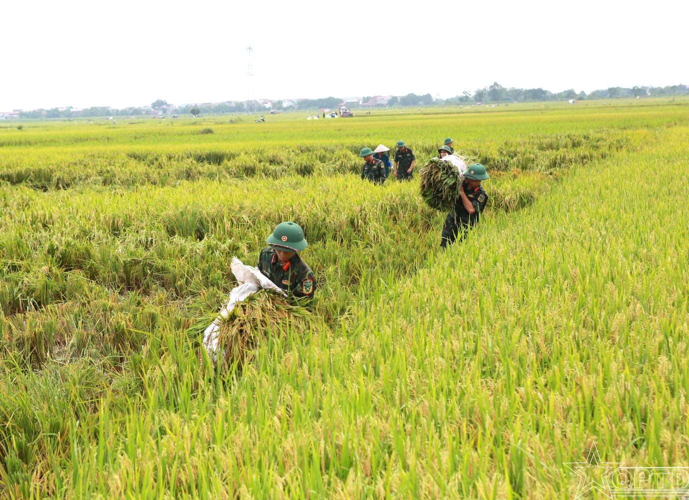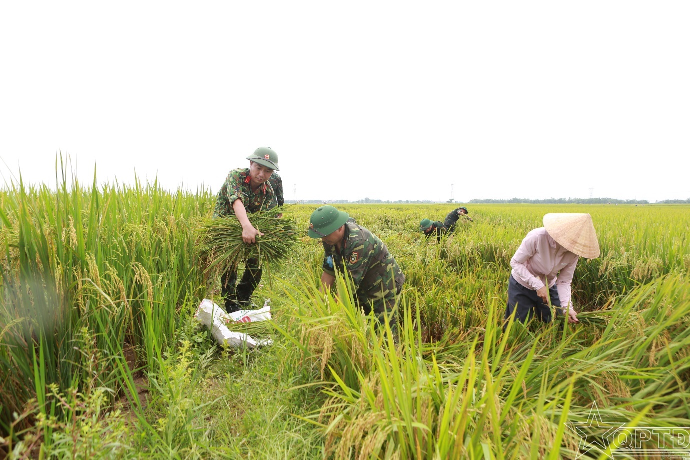Cán bộ, nhân viên Ban Chỉ huy PTKV 1-Sóc Sơn cùng với các lực lượng quân đội và dân quân tự vệ cùng giúp nhân dân thu hoạch lúa đã chín trước nguy cơ ngập úng do ảnh hưởng của mưa bão.