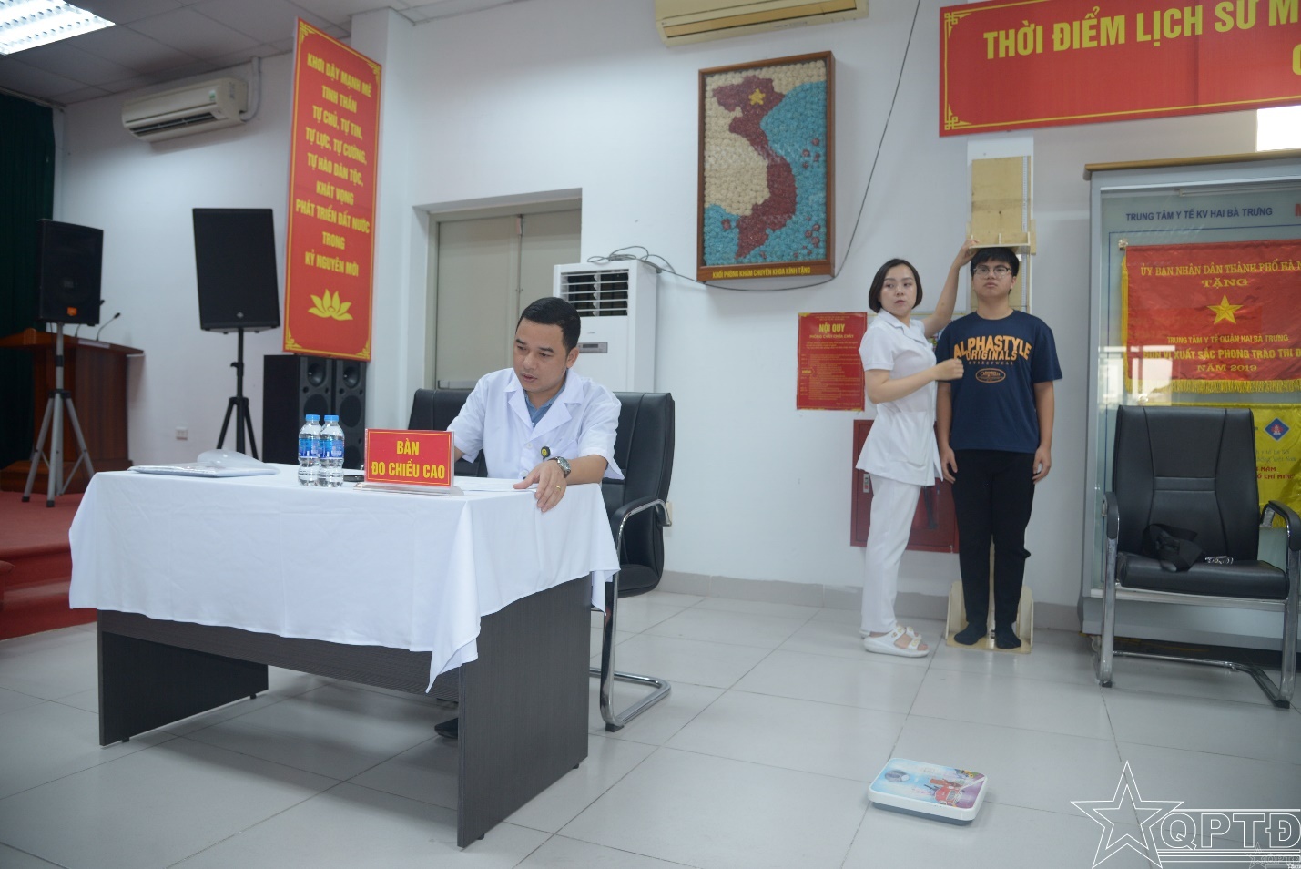 Thực hiện đo chiều cao và kiểm tra thể lực cho thanh niên tại bàn sơ khám, đảm bảo hồ sơ đăng ký NVQS được hoàn thiện đầy đủ và chính xác.
