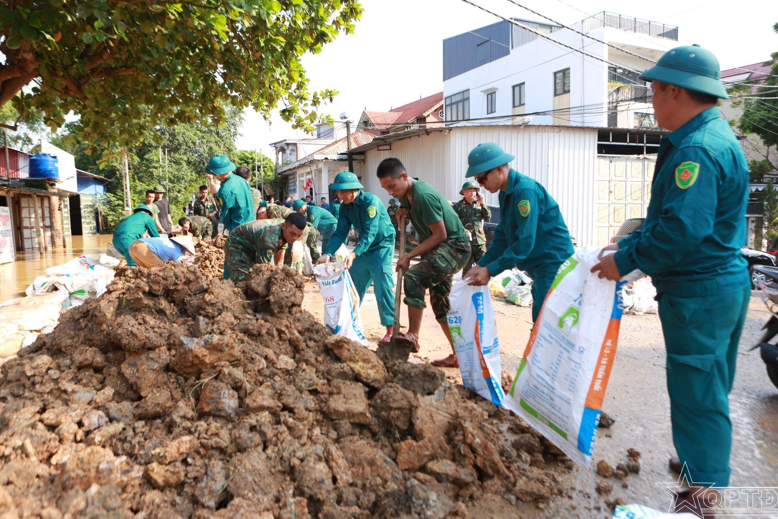 Cán bộ, chiến sĩ Ban Chỉ huy PTKV1-Sóc Sơn, các đơn vị quân đội đóng quân trên địa bàn, lực lượng dân quân đắp đê ngăn lũ ở xã Đa Phúc.