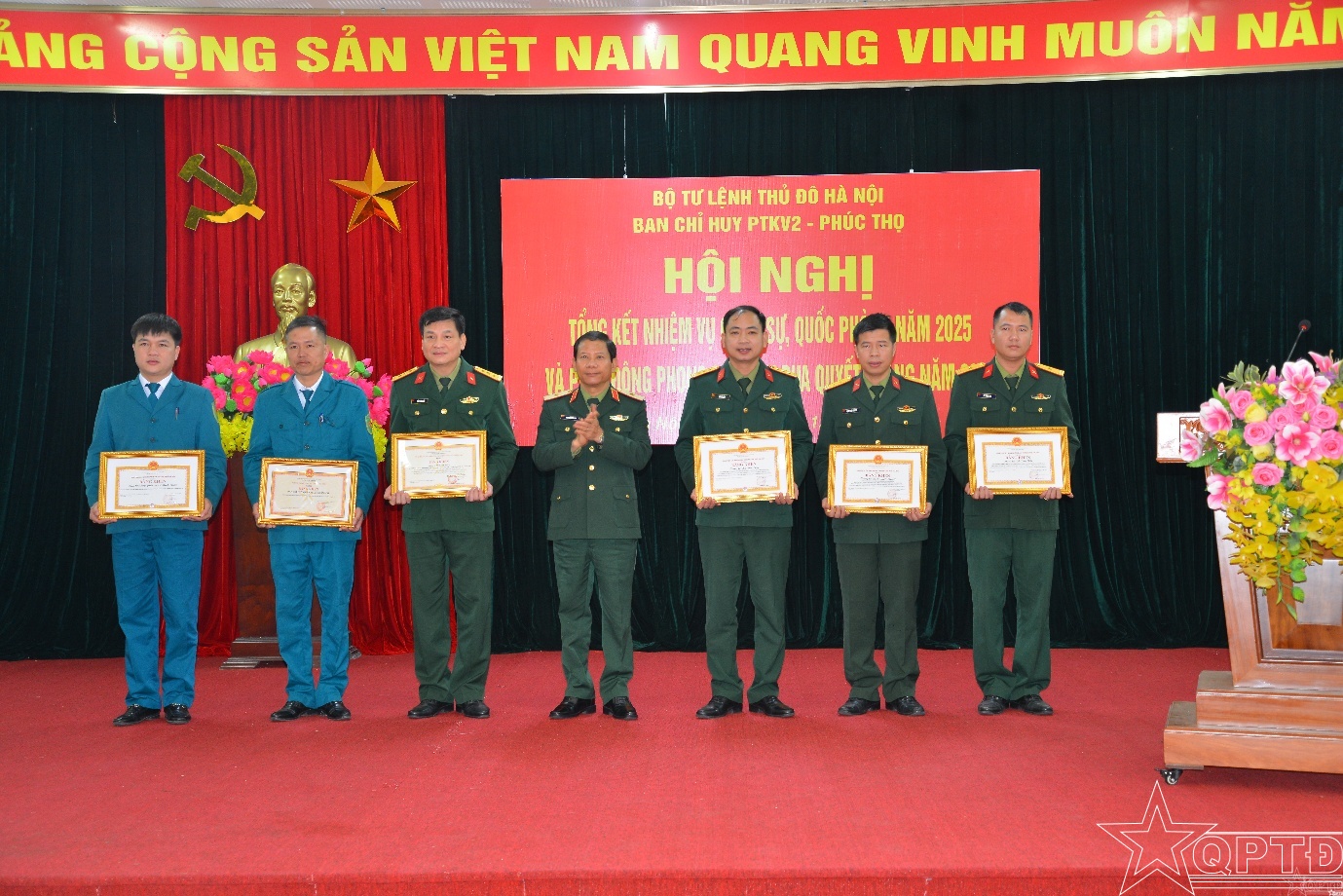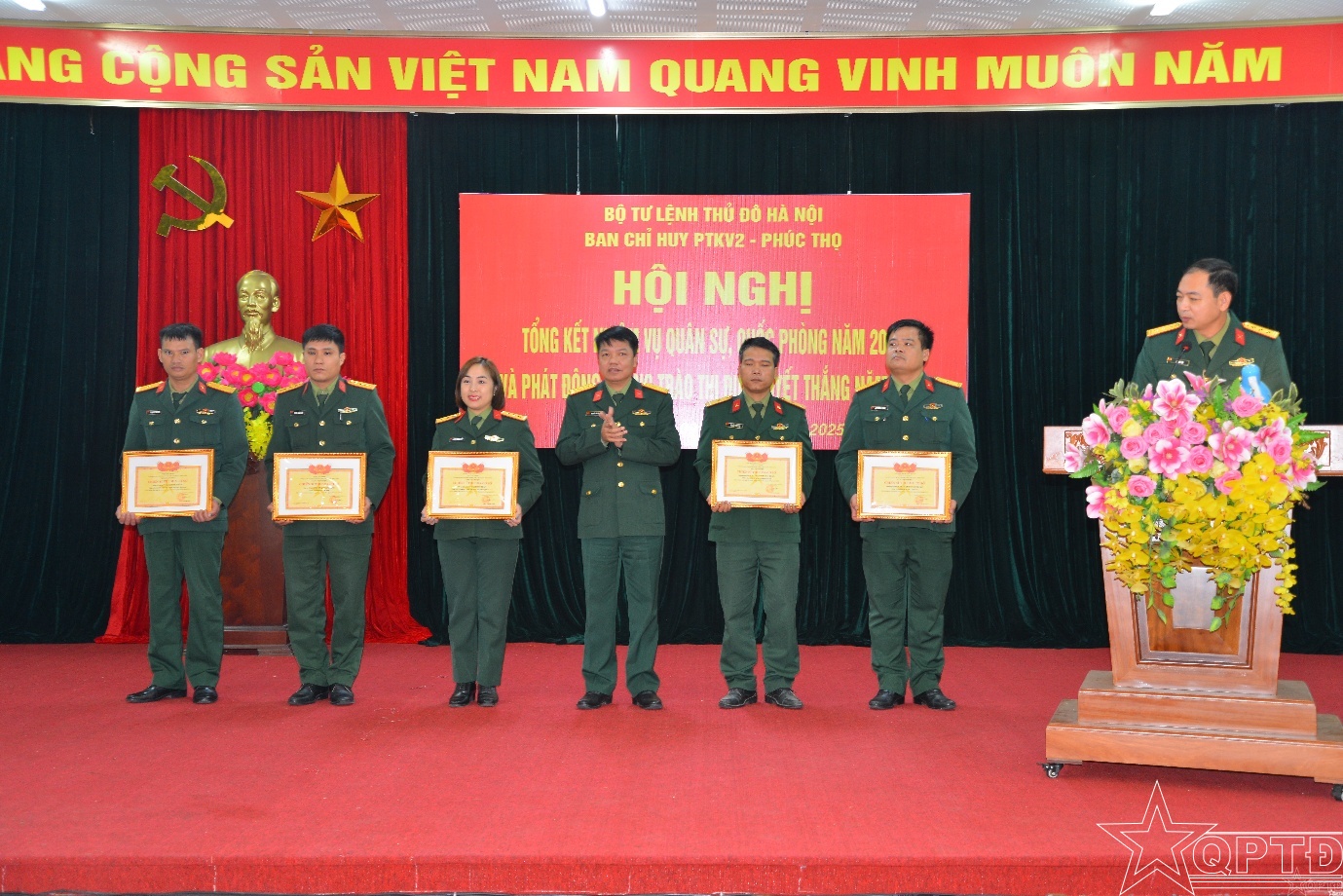 Tại Hội nghị, Ban Chỉ huy PTKV2 – Phúc Thọ đã tổ chức công bố, trao thưởng Bằng khen của UBND thành phố Hà Nội và Bộ Tư lệnh Thủ đô Hà Nội cho Ban CHQS xã Minh Châu và Ban CHQS xã Xuân Mai vì đã có thành tích xuất sắc trong khắc phục hậu quả cơn bão số 11. Trao tặng các Danh hiệu thi đua trong thực hiện Phong trào Thi đua Quyết thắng Bộ Tư lệnh Thủ đô Hà Nội tặng các tập thể, cá nhân gồm: Danh hiệu “Đơn vị Quyết thắng” cho 4 tập thể; Danh hiệu “Đơn vị Tiên tiến” cho 4 tập thể; Danh hiệu “Chiến sĩ Thi đua cơ sở” cho 10 cá nhân; Danh hiệu “Chiến sĩ Tiên tiến” cho 10 cá nhân. Riêng Ban Chỉ huy PTKV2 – Phúc Thọ cũng đã tặng Danh hiệu Danh hiệu “Chiến sĩ thi đua cơ sở” cho 8 cá nhân; Danh hiệu “Chiến sĩ Tiên tiến” cho 30 cá nhân vì đã có thành tích xuất sắc trong thực hiện Phong trào Thi đua Quyết thắng năm 2025.