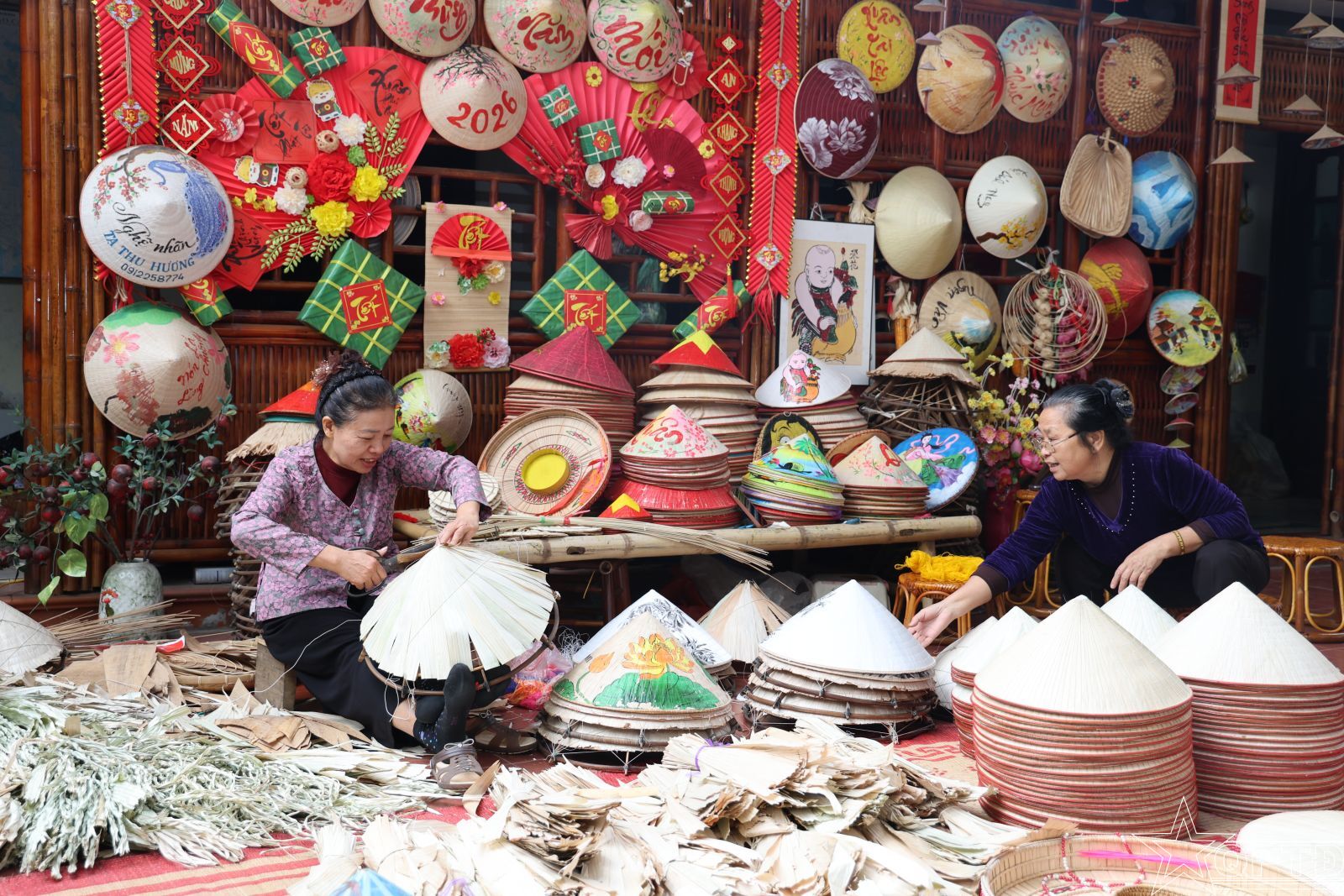Buổi sáng ở làng Chuông bắt đầu với hình ảnh những người phụ nữ trung niên và cao tuổi ngồi trước hiên nhà, bên những khung nón đơn sơ. Đôi tay họ thoăn thoắt, những ngón tay chai sạn vì năm tháng vẫn uyển chuyển luồn từng mũi kim qua 16 lớp vành tre và hai lớp lá cọ. Họ làm việc trong im lặng, nhưng không hề cô độc. Cứ vài nhà lại có một nhóm tụ tập, vừa làm vừa trò chuyện, chia sẻ những câu chuyện thường nhật, từ chuyện con cháu, chuyện làng xóm đến những kỹ thuật làm nón mới học được.