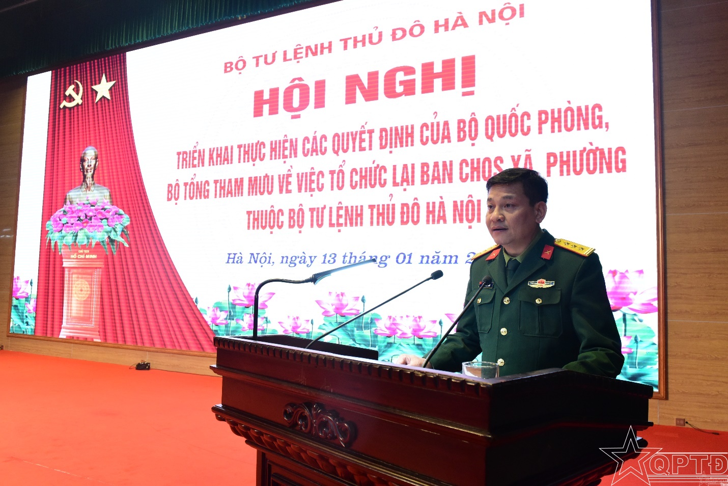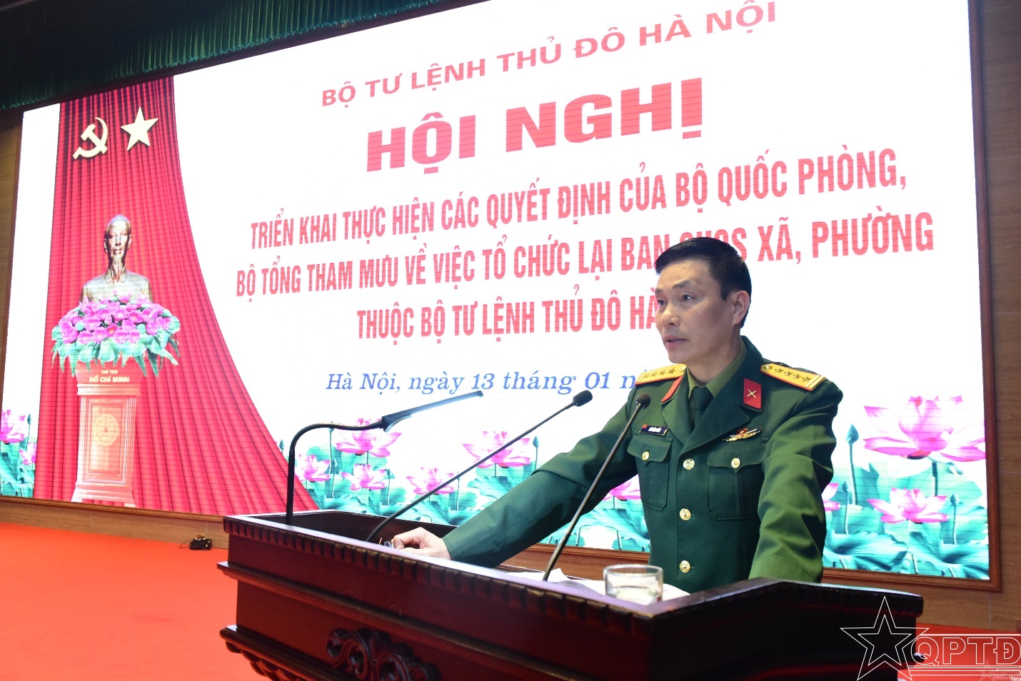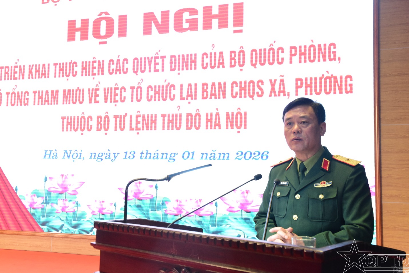 QPTĐ-Chiều 13/1/2026, Bộ Tư lệnh Thủ đô Hà Nội đã tổ chức hội nghị triển khai thực hiện các quyết định của Bộ Quốc phòng, Bộ Tổng Tham mưu về việc tổ chức lại Ban Chỉ huy quân sự (CHQS) xã, phường. Đây được xem là đợt điều chỉnh quy mô lớn, mang tính chiến lược nhằm tinh gọn, mạnh hóa lực lượng quân sự cơ sở, đáp ứng yêu cầu bảo vệ Thủ đô trong tình hình mới. Thiếu tướng Đào Văn Nhận, Ủy viên Ban Thường vụ Thành ủy, Tư lệnh Bộ Tư lệnh Thủ đô Hà Nội chủ trì hội nghị. Cùng dự có Thiếu tướng Lưu Nam Tiến, Thành ủy viên, Phó Bí thư Thường trực Đảng ủy, Chính ủy Bộ Tư lệnh Thủ đô Hà Nội; các đồng chí trong Thường vụ Đảng ủy, thủ trưởng Bộ Tư lệnh và lãnh đạo cấp ủy, chính quyền 126 xã, phường.