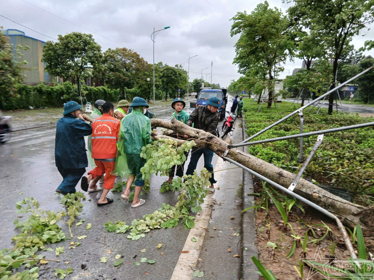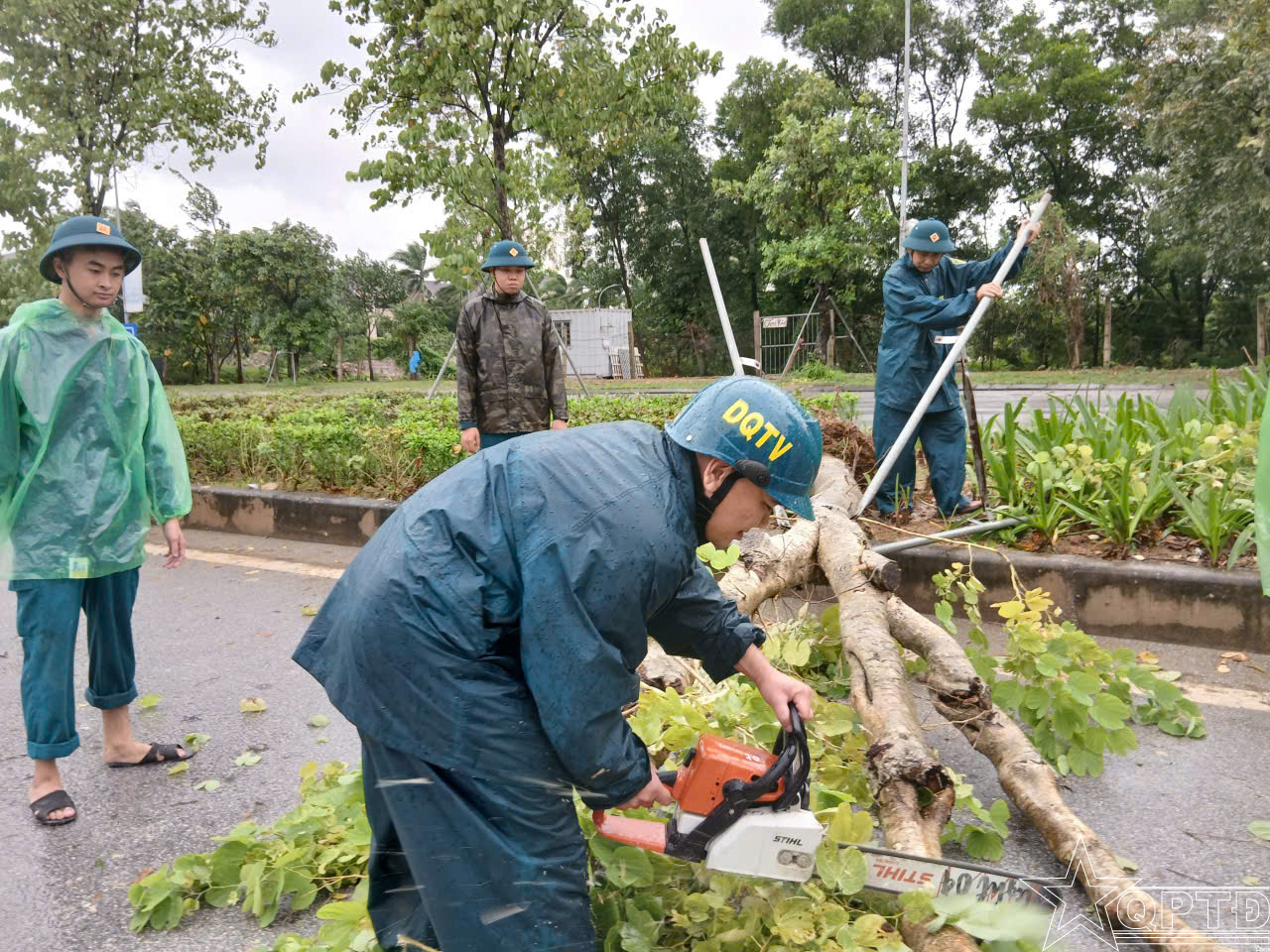 Dân quân xã Quốc Oai tích cực khắc phục hậu quả mưa bão