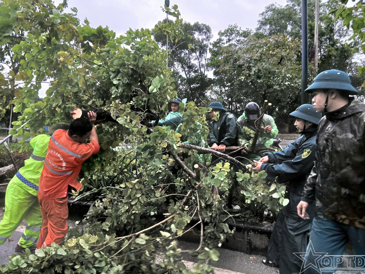 Dân quân xã Quốc Oai tham gia khắc phục cây đổ do ảnh hưởng của hoàn lưu bão số 10.