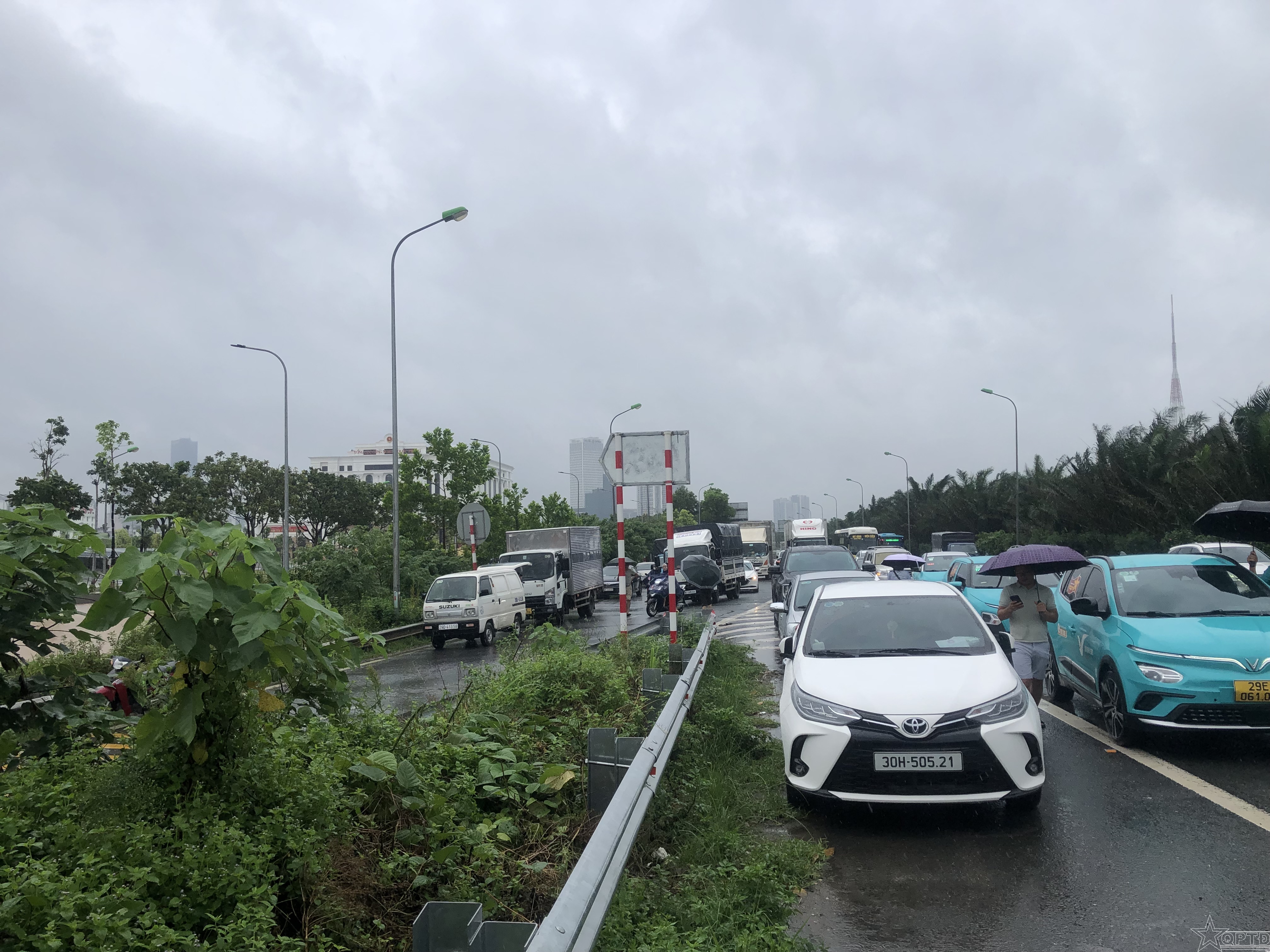 Nhiều ô tô dừng lại trên Đại lộ Thăng Long do lối ra đoạn Bảo tàng Lịch sử Quân sự Việt Nam bị ngập sâu.