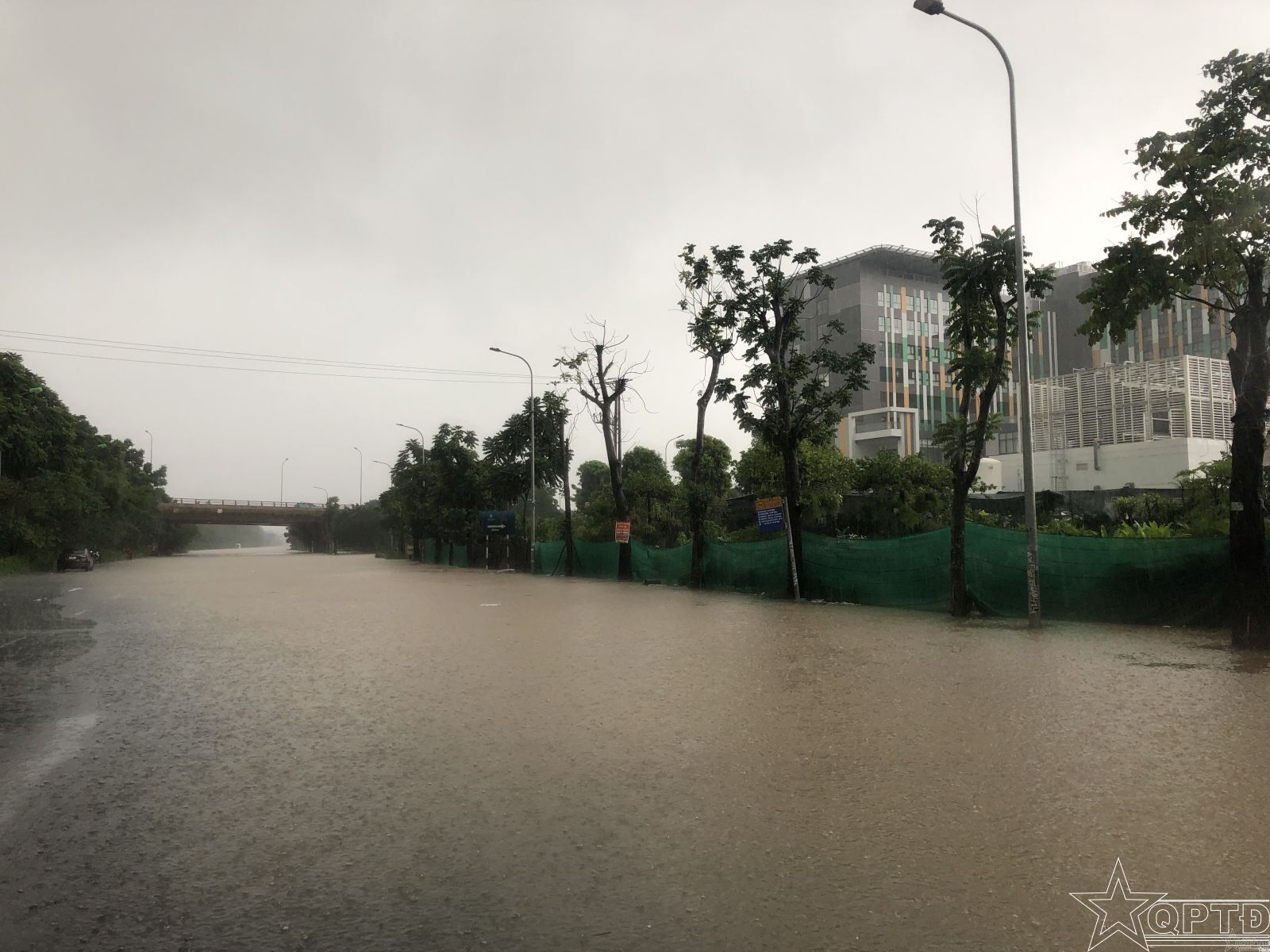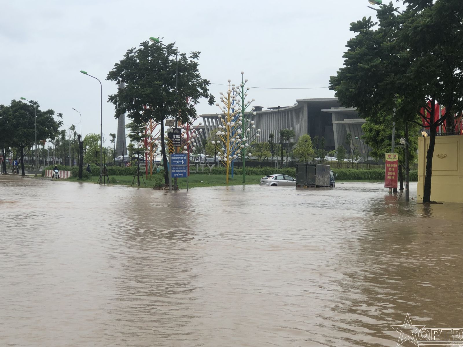 Đường gom Đại lộ Thăng Long đoạn gần Bệnh viện đa khoa Vinmec Smart City ngập sâu.