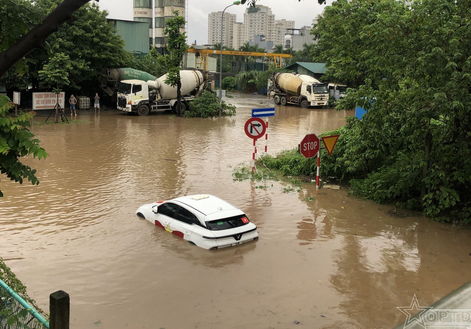 Lối rẽ vào hầm chui nút giao Đại học Tây Nam bị ngập sâu, 2 ô tô chết máy chờ cứu hộ đến để di chuyển.