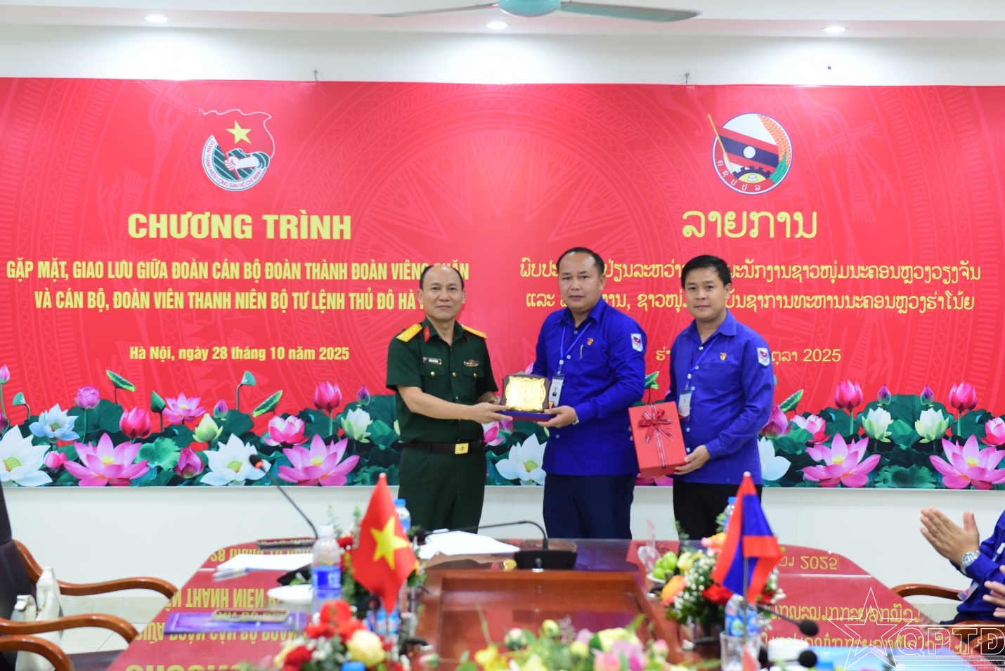 Đại diện Bộ Tư lệnh Thủ đô Hà Nội và Đoàn cán bộ Thành đoàn Viêng Chăn (Lào) trao quà lưu niệm, thể hiện tình đoàn kết, hữu nghị giữa tuổi trẻ hai Thủ đô.
