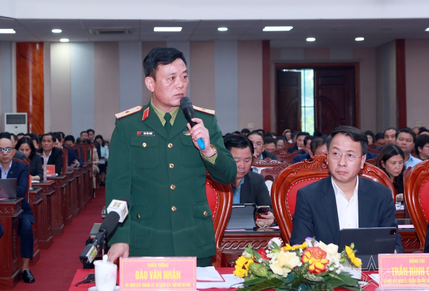 Thiếu tướng Đào Văn Nhận, Uỷ viên Ban Thường vụ Thành uỷ, Tư lệnh Bộ Tư lệnh Thủ đô Hà Nội phát biểu tại Hội nghị.