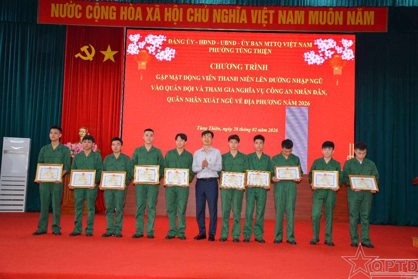 Phát biểu tại buổi gặp mặt, Chủ tịch UBND phường Nguyễn Viết Đạt ghi nhận và biểu dương tinh thần trách nhiệm, ý thức sẵn sàng lên đường của 31 thanh niên trúng tuyển; đồng thời cảm ơn sự đồng thuận, ủng hộ của các gia đình. Đồng chí Chủ tịch UBND phường Tùng Thiện nhấn mạnh, môi trường quân đội và công an là trường học lớn để rèn luyện bản lĩnh chính trị, ý thức tổ chức kỷ luật, tinh thần trách nhiệm và tác phong chính quy; đề nghị các thanh niên nhanh chóng hòa nhập đơn vị mới, đoàn kết, khắc phục khó khăn, hoàn thành xuất sắc mọi nhiệm vụ được giao, xứng đáng với truyền thống quê hương.
