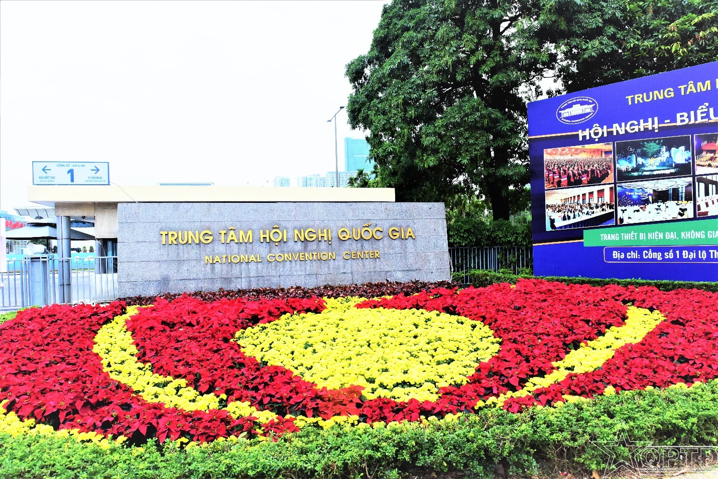 Thảm hoa trang trí chào mừng Đại hội bừng nở khoe sắc tại cổng Trung tâm Hội nghị Quốc gia.