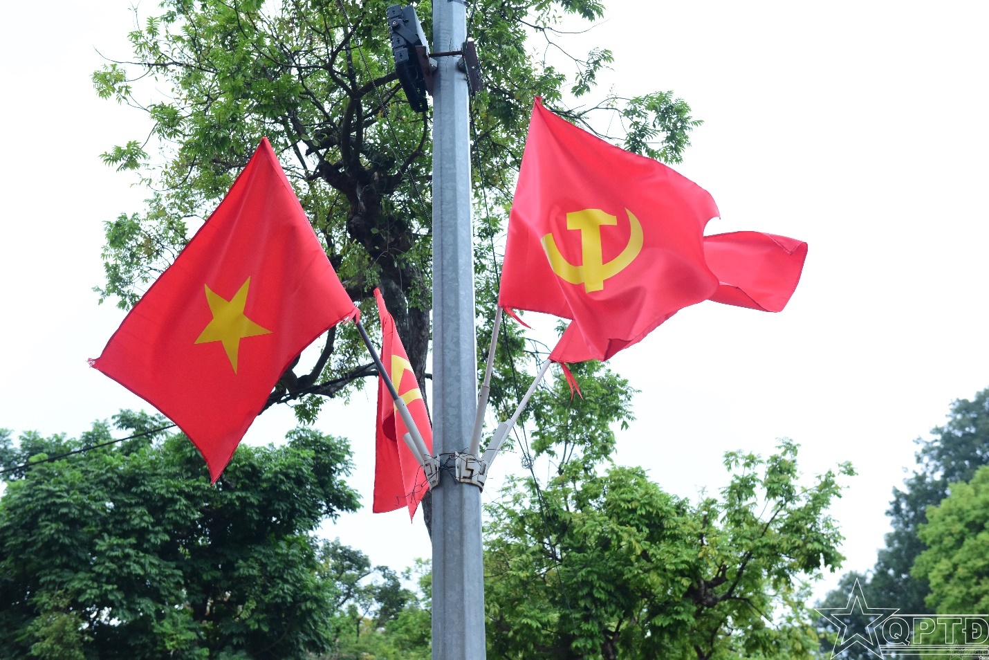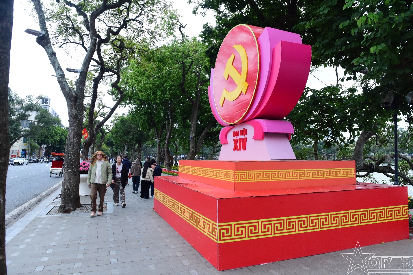 Biểu tượng búa liềm tại phố đi bộ hồ Hoàn Kiếm thu hút sự quan tâm của du khách quốc tế khi tham quan Thủ đô Hà Nội. Chi tiết khẩu hiệu, biểu trưng Đại hội XIV.