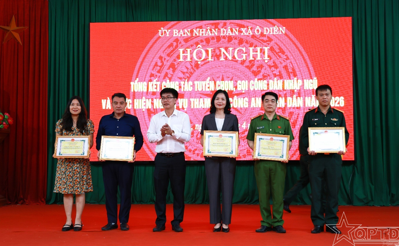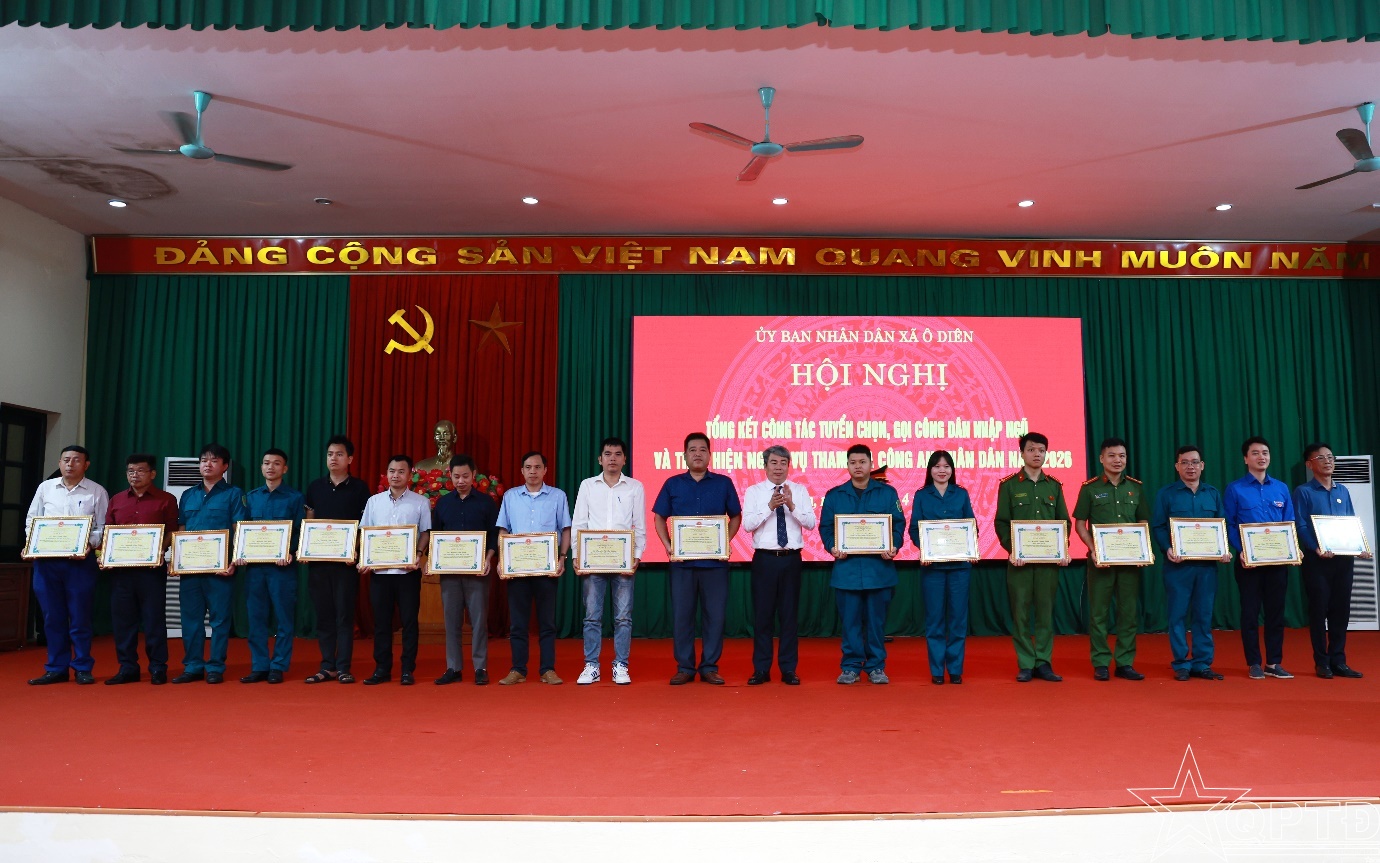 Nhân dịp này, UBND xã Ô Diên đã khen thưởng cho các tập thể, cá nhân có thành tích xuất sắc trong công tác tuyển chọn gọi công dân nhập ngũ và thực hiện nghĩa vụ tham gia Công an nhân dân năm 2026.