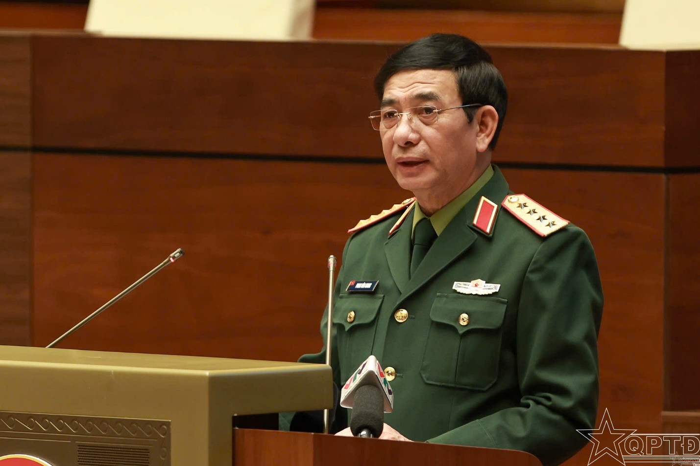 Đại tướng Phan Văn Giang, Ủy viên Bộ Chính trị, Bộ trưởng Bộ Quốc phòng trình bày chuyên đề "Tư duy, nhận thức mới về quốc phòng, bảo vệ Tổ quốc của Đại hội XIV". Ảnh:VGP/ Nhật Bắc