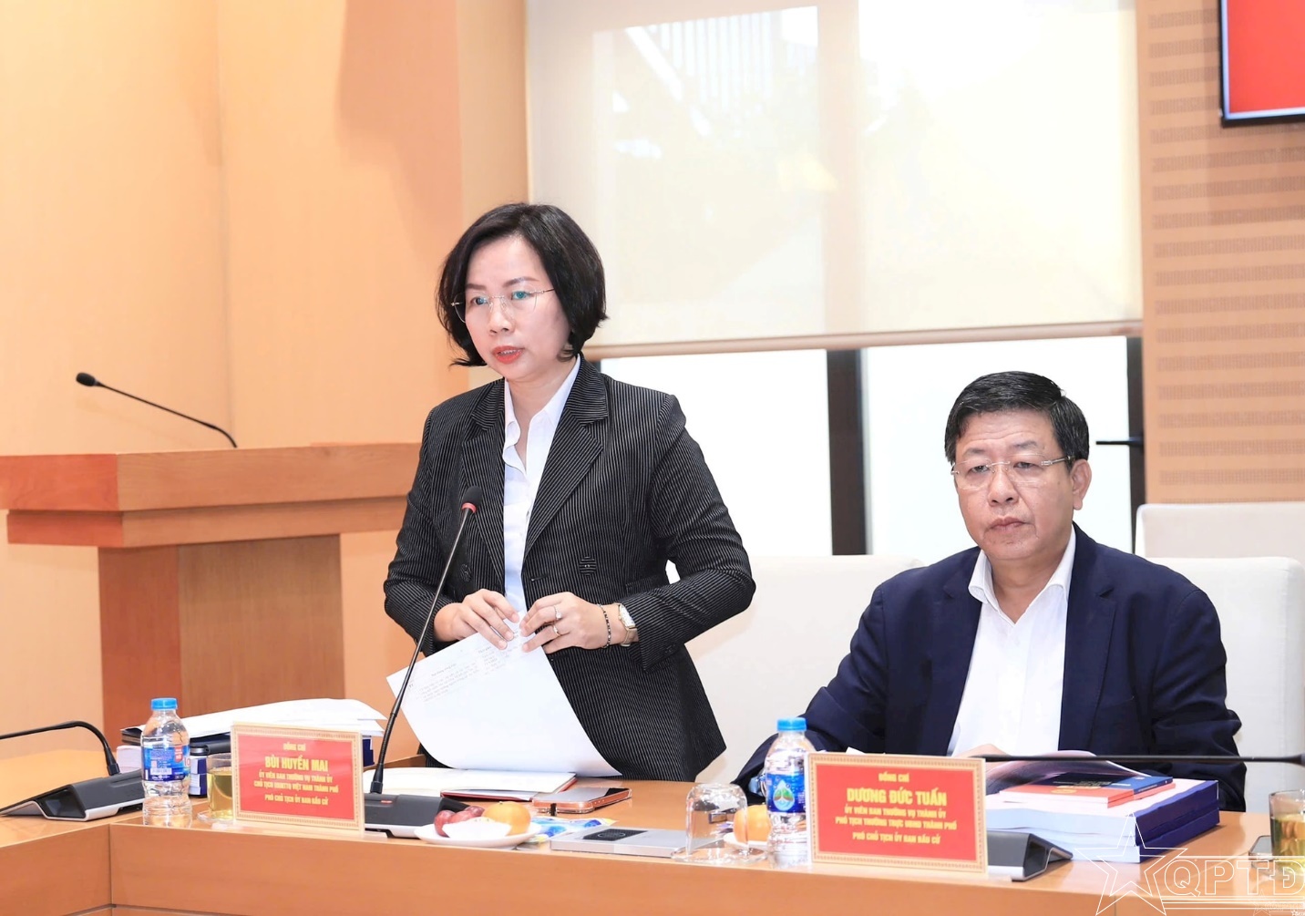 Chủ tịch Ủy ban Mặt trận Tổ quốc Việt Nam thành phố Hà Nội Bùi Huyền Mai phát biểu tại phiên họp.
