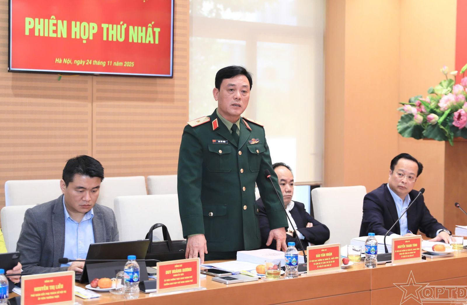 Thiếu tướng Đào Văn Nhận, Ủy viên Ban Thường vụ Thành ủy, Tư lệnh Bộ Tư lệnh Thủ đô Hà Nội phát biểu tại phiên họp.