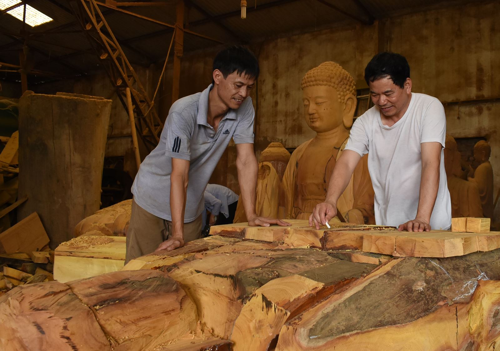 Chúng tôi vào sâu trong làng, tìm đến Xưởng điêu khắc của nghệ nhân Nguyễn Văn Trúc. Ông không cần cửa hàng ở ngoài phố nhưng lại có nhiều hợp đồng, từ các ngôi chùa trên khắp đất nước. Hàng chục tượng phật lớn, nhỏ đang được hoàn thiện trong xưởng của ông chờ xuất đi. Người thợ tài hoa này đã được phong nhiều danh hiệu cao nhất trong làng nghề thủ công mỹ nghệ của Nhà nước và Hà Nội.